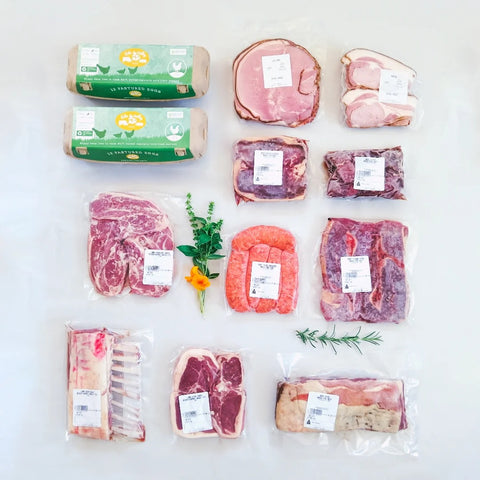 Each month, 3kg of meat & 1 dozen pasture raised eggs. Primarily the meat is our grass fed and finished Brangus beef, however we aim to include 500g of cured pork (bacon, kabana, etc) and a mix of pork and lamb when available seasonally.